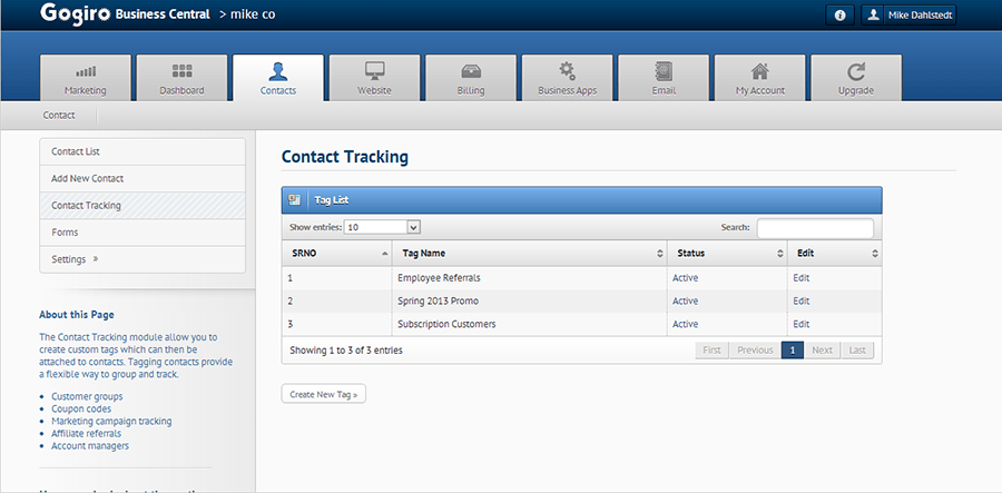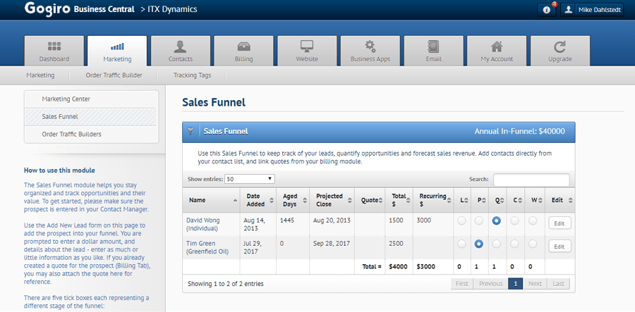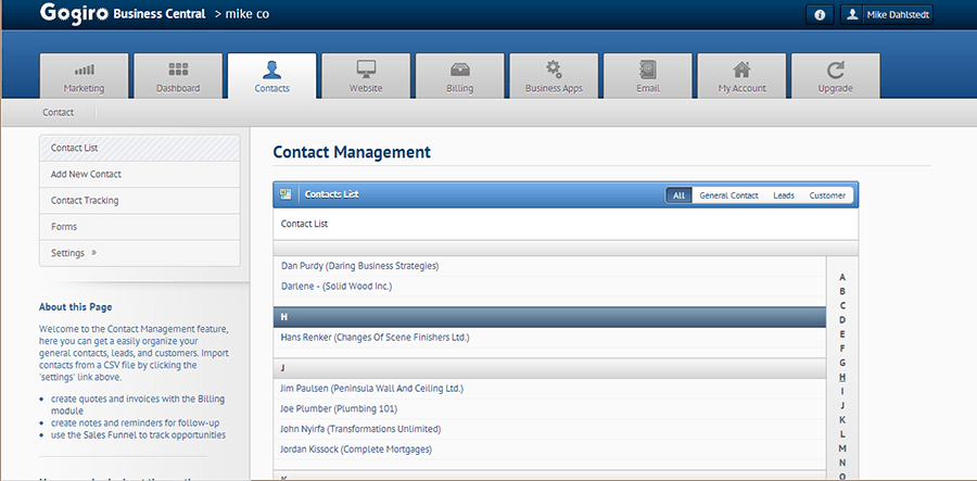 Hosting your business on Gogiro’s Business Central platform gives you access to Gogiro’s support team and digital marketing services. The Business Central platform offers free tools for small businesses to manage a contact database, sales funnel, quotes and billing, and website statistics.
